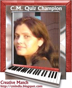 आज क्रियेटिव मंच के लिए बहुत ख़ुशी का अवसर है ! जैसा कि घोषणा की गयी थी - C.M. Quiz में कोई भी प्रतियोगी तीब बार प्रथम स्थान प्राप्त करता है तो उसे चैम्पियन का प्रमाण-पत्र दिया जाएगा ! आज सुश्री अल्पना वर्मा जी ने तीसरी जीत हासिल करते ही यह मुकाम भी हासिल कर लिया और बन गयीं :